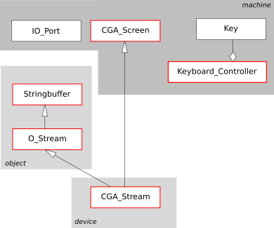 These are supposed to be used similar to the C++ Standard Input / Output Streams (iostream) library and implemented with the help of the classes IO_Port, CGA_Screen, Stringbuffer, O_Stream and CGA_Stream. From these classes, the provided template code already contains IO_Port.