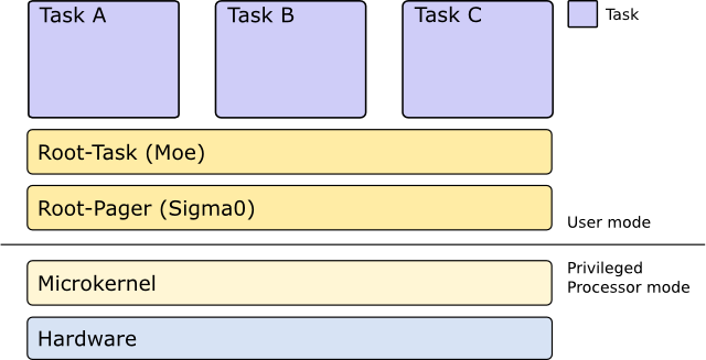 The L4Re Microkernel is the lowest-level component of software running in an L4Re-based system. The microkernel is the only component that runs in privileged processor mode. It does not include complex services such as program loading, device drivers, or file systems; those are implemented in user-level programs on top of it (a basic set of these services and abstractions is provided by the L4 Runtime Environment).