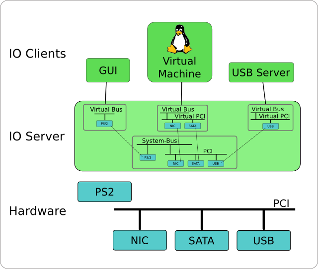 Each Io server client is provided with its own virtual bus which it can iterate to find devices. A virtual PCI bus may be a part of this virtual bus.